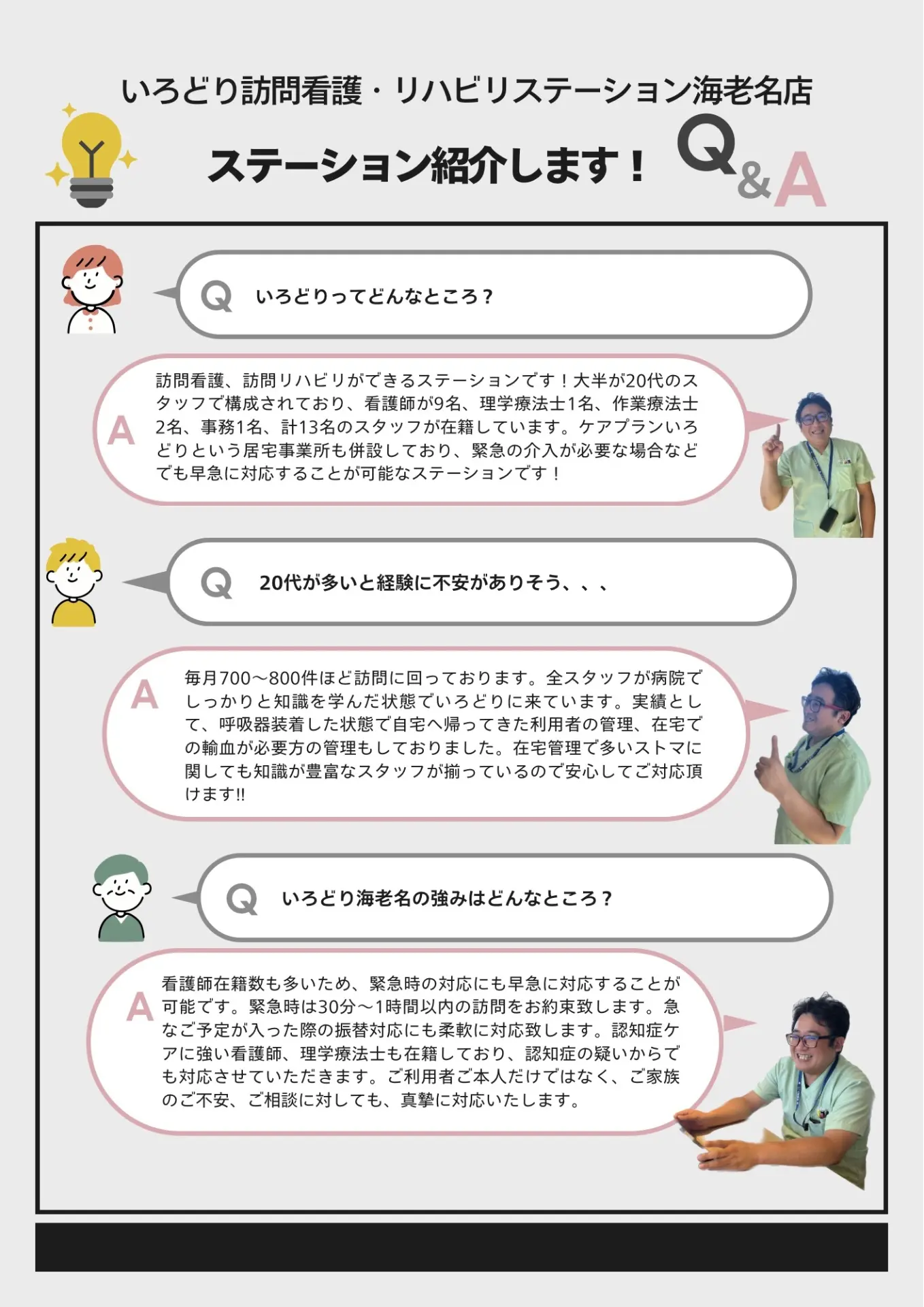 近年、在宅医療の需要も高く病院から在宅へ戻られるケースが増えてきております。そんな中、在宅へ戻る事での家族の負担、看れるかどうかの不安が強くなかなか帰したくても帰せない状況かと思います。また、病院側も以前よりも短い入院期間で退院を勧めなくてはならず不安を抱えたまま、在宅へ戻ってくるケースも今後増えてくると思われます。 私達、いろどりの取り組みとして「すべての人を在宅へ」という想いから事業が立ち上がり、海老名店は4店舗目の事業所となります。 様々な分野の看護師が揃っており、24時間の緊急対応も十分な体制を整えております。過去の例では、人工呼吸器装着している利用者様や、在宅で輸血管理を行った利用者様もおります。また、お看取りの面でもご本人様、ご家族の方に寄り添い最後の時間をよりよく過ごしていただくようお力添えもさせて頂いております。 今までの実績として看護の分野でご依頼をお断りした事はございません。「1日でも早く家に帰りたい」そんな想いを叶えられる店舗であります。 同施設内に居宅介護支援事業所「ケアプランいろどり」も併設しているのでケアマネジャーが見つからなくても、こちらの事業所にお声をかけていただければと思います。 地域に寄り添った事業所を目指し、在宅へ帰ることを諦めずにその人らしくいれるよう私達がお力添え致します。