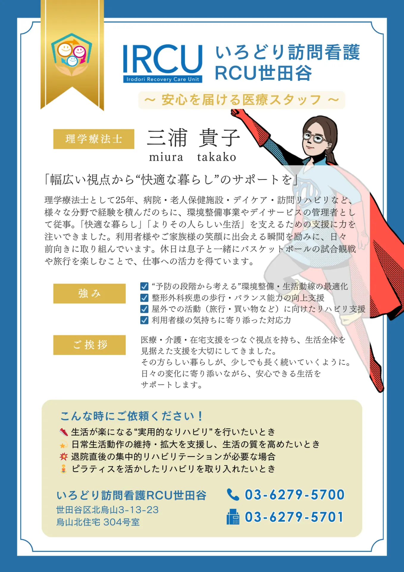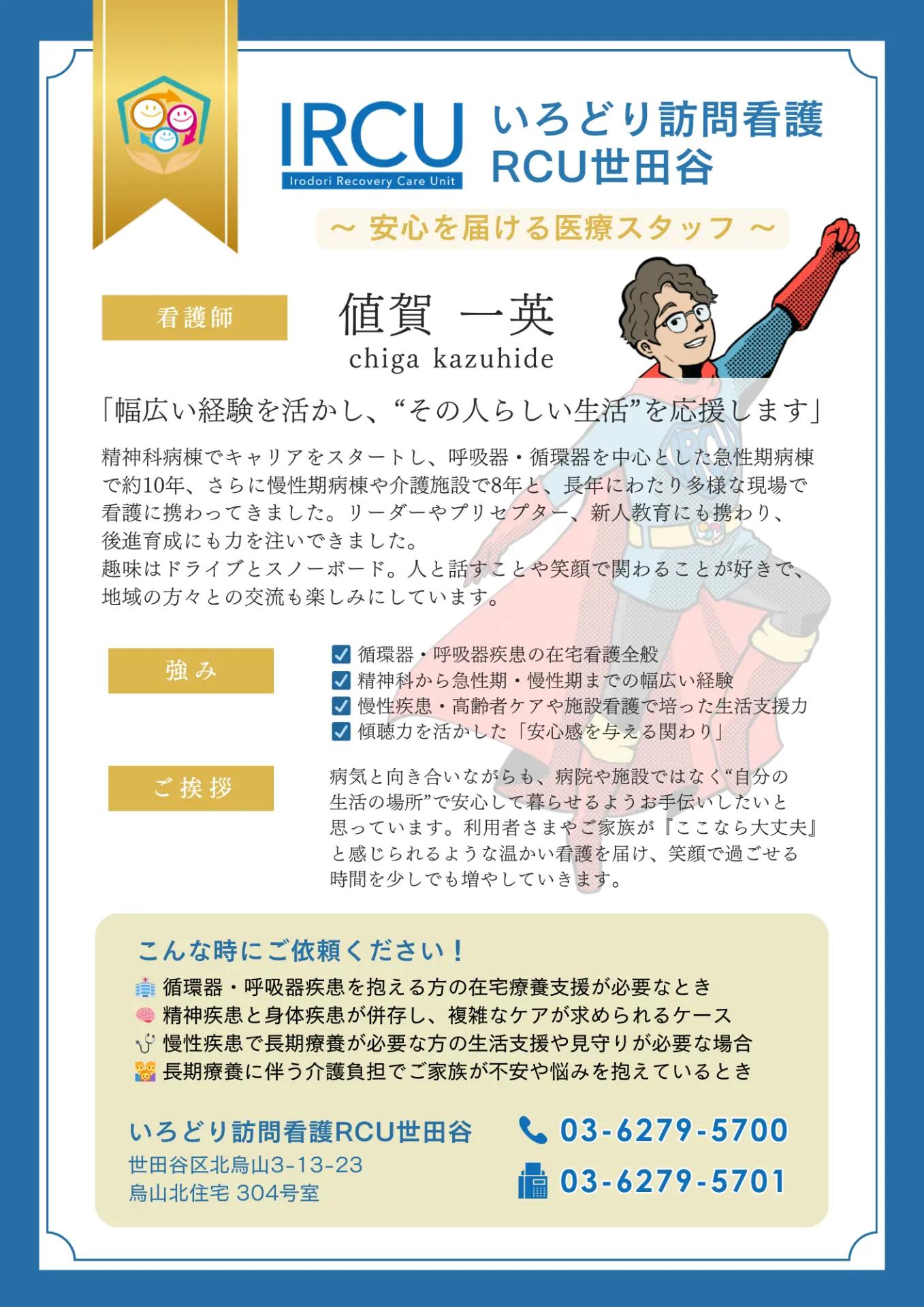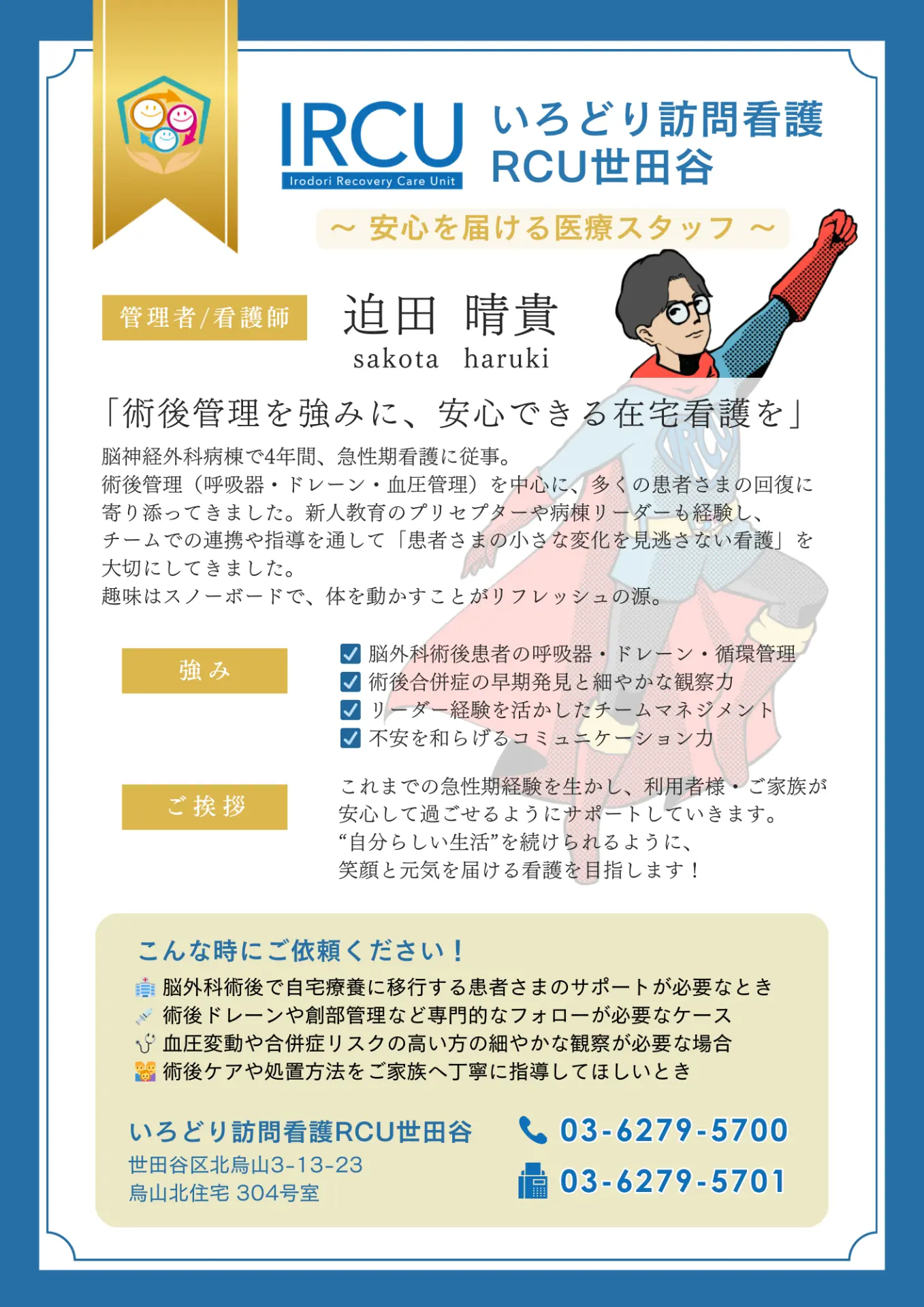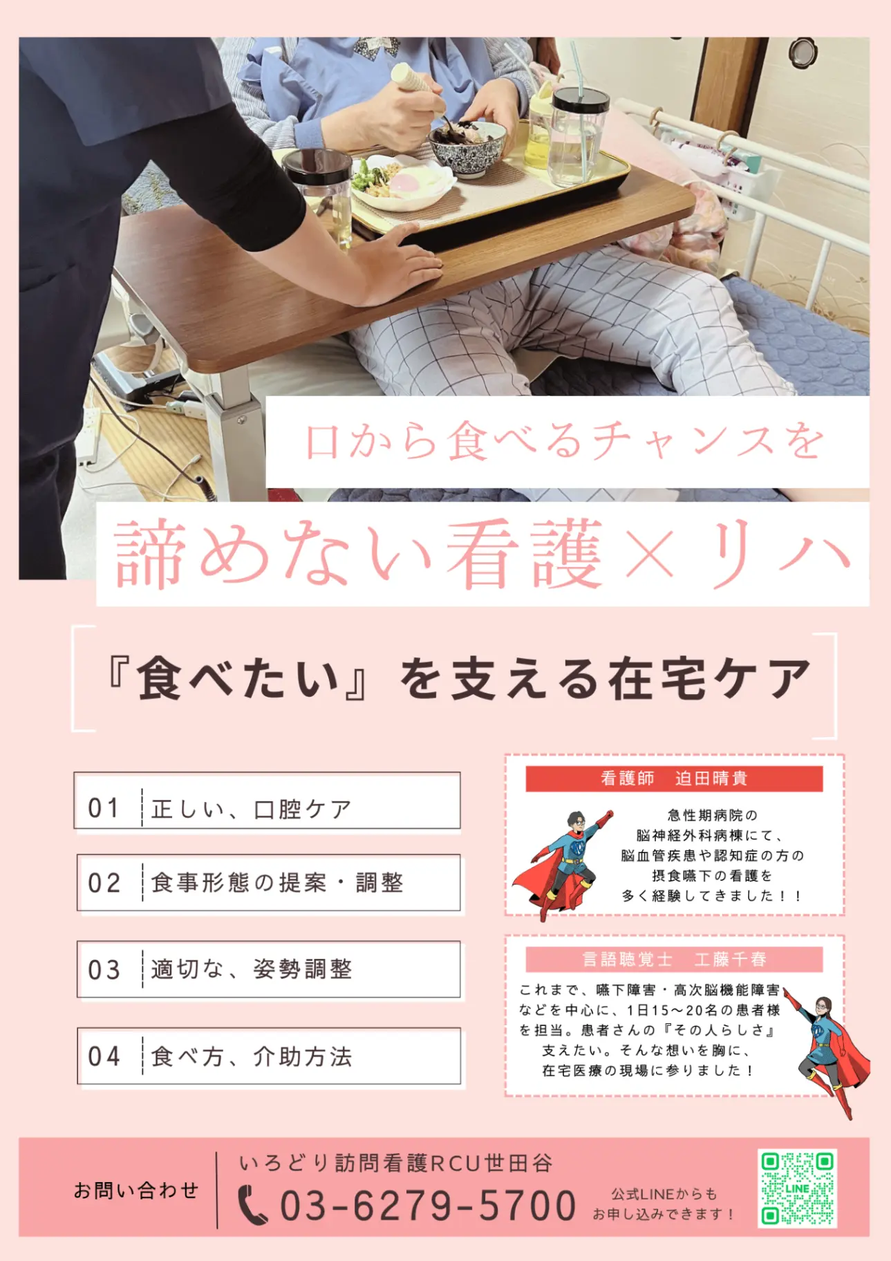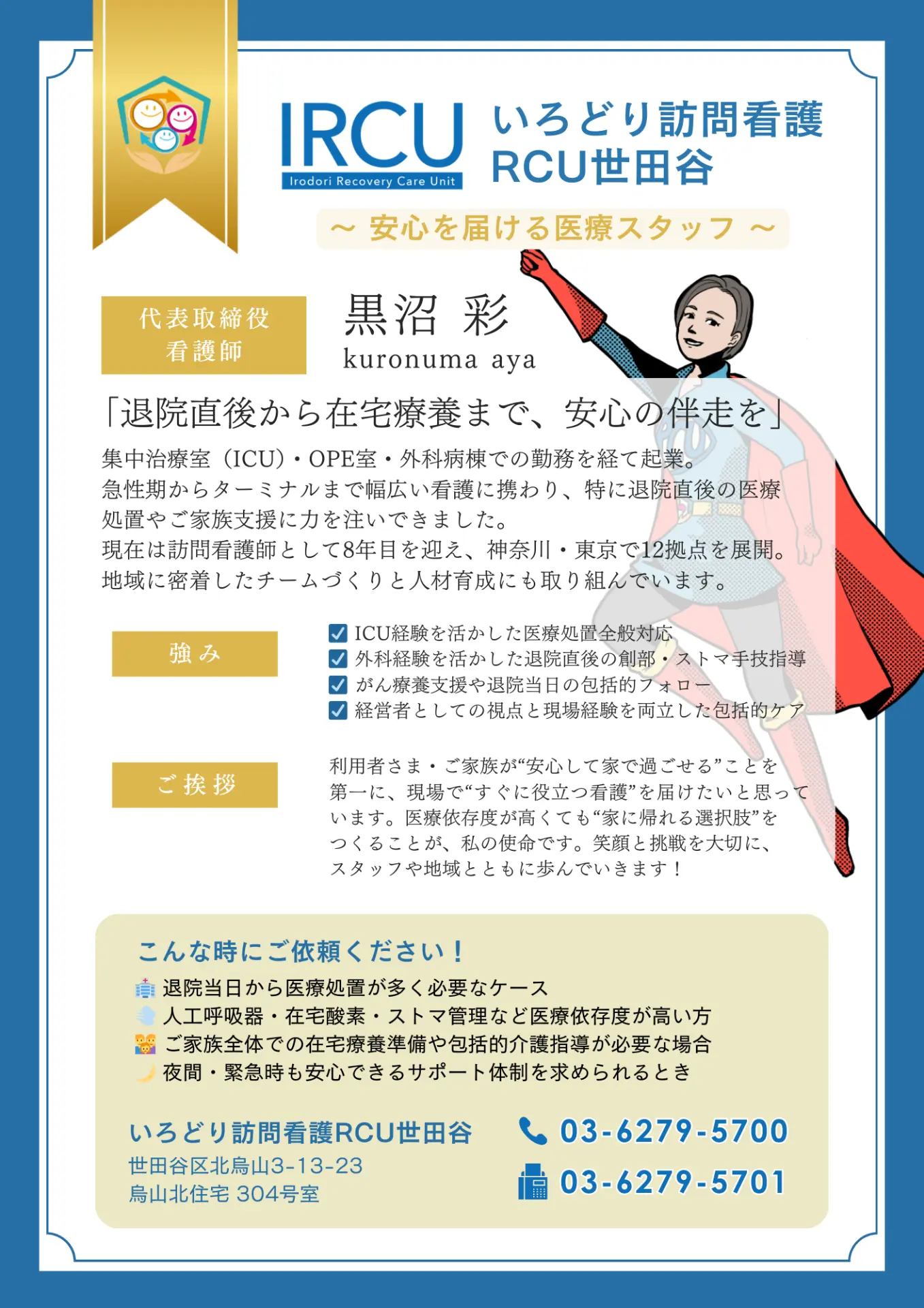 在宅医療の需要が高まる中で、「病院と在宅のあいだ」で生じるミスマッチが、不安を生むことがあります。 私たちはその“すき間”をなくしたい——そんな想いから生まれたのが、いろどりのRCUです。 「退院したい」「家に帰りたい」という願いを安心して叶えられるように。 そして「本当は帰りたくない」けれど「帰さなければならない」——そんな葛藤にも寄り添えるように。 医療・リハビリ・介護の専門職が一つのチームとなって伴走し、 ひとりひとりの“生き方”を支える拠点、それがいろどり訪問看護RCU世田谷です。 “帰る”をゴールにせず、“生きる”を支えるケアを届けます。 医療依存度の高い方や、急性期から在宅へ移行される方が、安心して“家で生きる”を選べるように。 医師・病院・ケアマネジャー・訪問診療・リハビリなど、地域の多職種と密に連携し、 「医療」「生活」「心」を切れ目なくつなぐ仕組みをつくっています。